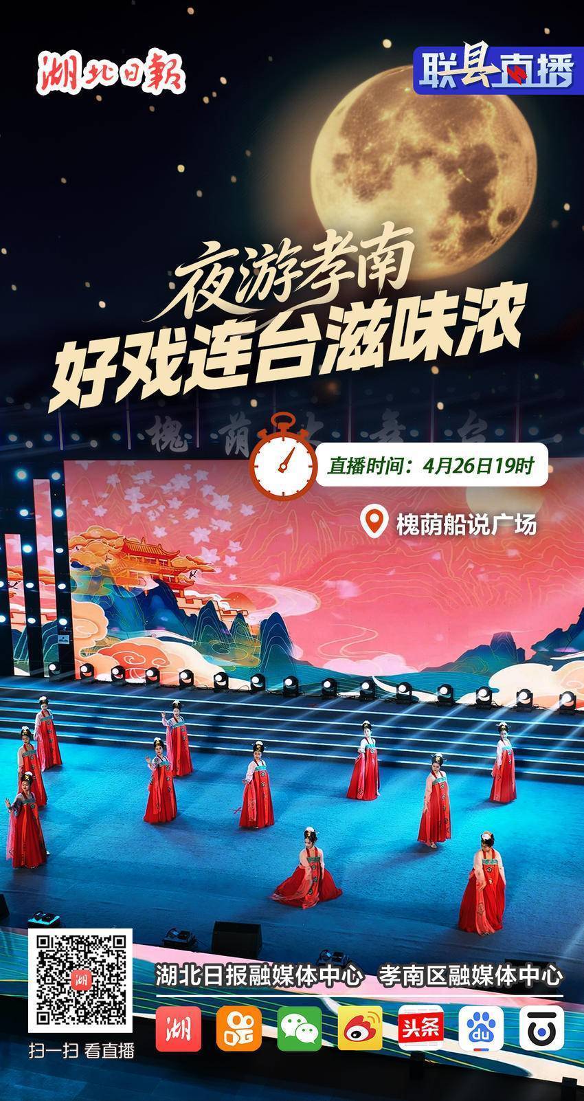4月26日19时,湖北日报联动孝南区融媒体中心,邀您走进槐荫船说广场。看孝文化演出、楚剧经典轮番登场,赏湖面打铁花首秀,享古风船游沉浸式体验,还有龙虾美食节开笼迎客。锁定湖北日报客户端,共赴一场有戏有味的春日之夜。