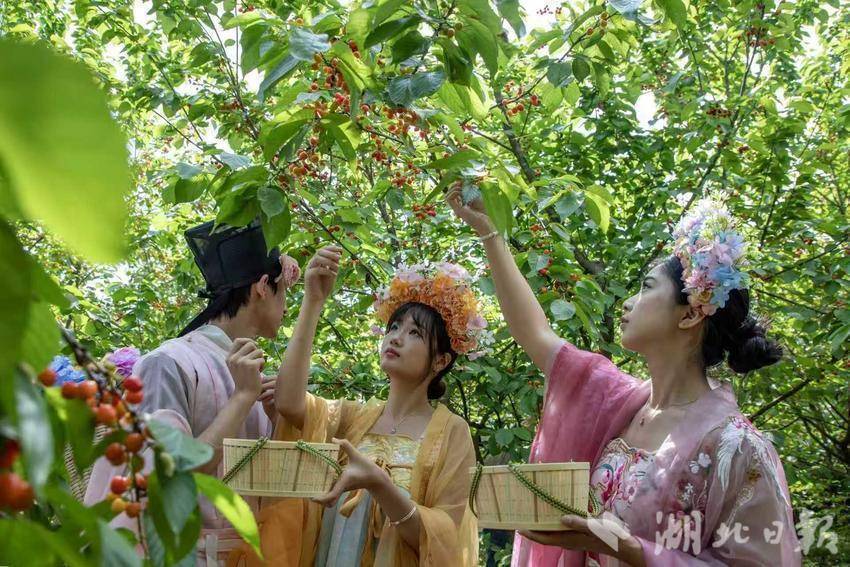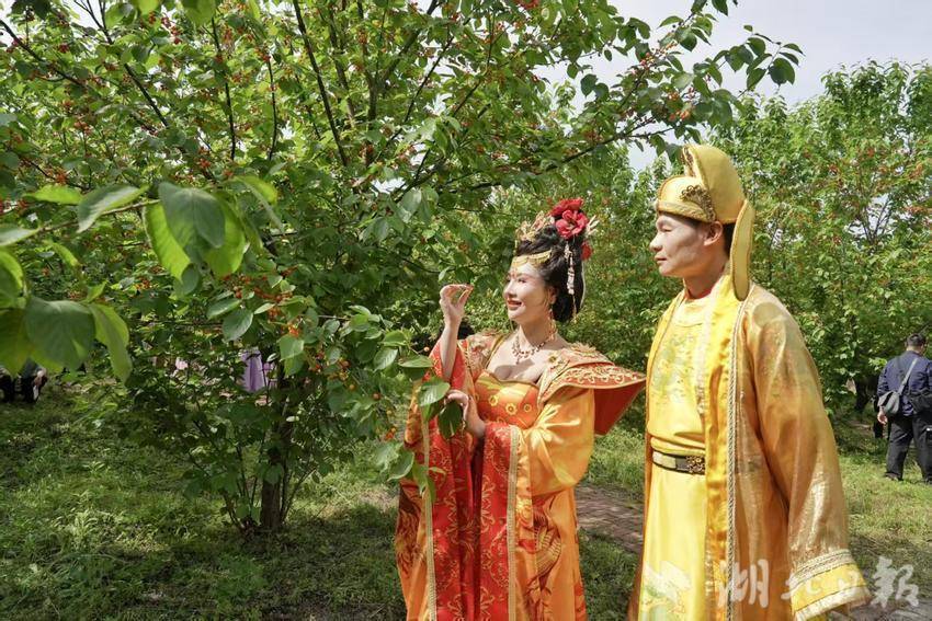樱桃与长安的缘分,远不止一道市井点心。唐代每年四月,皇帝率百官于禁苑樱桃园举行“荐樱礼”,将初熟樱桃供奉宗庙、分赐后宫与宗室,樱桃是早春第一果,亦是天子赐予的恩荣。白居易写下“樱桃樊素口”,樱桃成为美的标尺;热播剧《唐朝诡事录》中那一笼笼透着鲜红的樱桃毕罗,更让无数观众遥想盛唐市井烟火气。相传唐中宗李显被贬房州时,随行宫廷御厨将长安樱桃种植技艺与“樱桃饆饠”制法传入当地,房县樱桃从此成为进贡长安的珍果。如今在西安长安十二时辰主题街区的“通善人间”,游客仍能亲口品尝复刻版的樱桃毕罗。