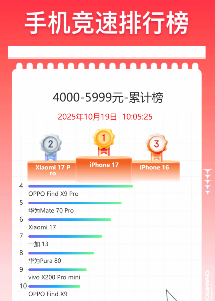 相比之下,原本被外界认为销量可能最好,也是最便宜的小米17标准版表现却差强人意。在4000~5999元价位段竞速榜,销量前五名分别是iPhone17、小米17 Pro、iPhone 16、OPPO Find X9 Pro、华为Mate70 Pro。小米17只排到第六名,远不如小米17 Pro表现更好,甚至也没能打败OPPO新机,这一点同样与外界的预期不同。